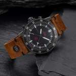 まさに質実剛健なミッションタイマーの限定モデルは、シリコンストラップの他にビンテージ仕上げのカウレザーストラップが付属。世界限定500本で今夏に発売予定です。