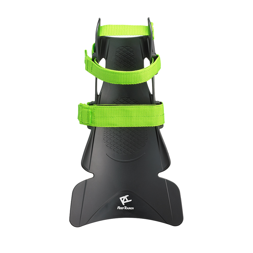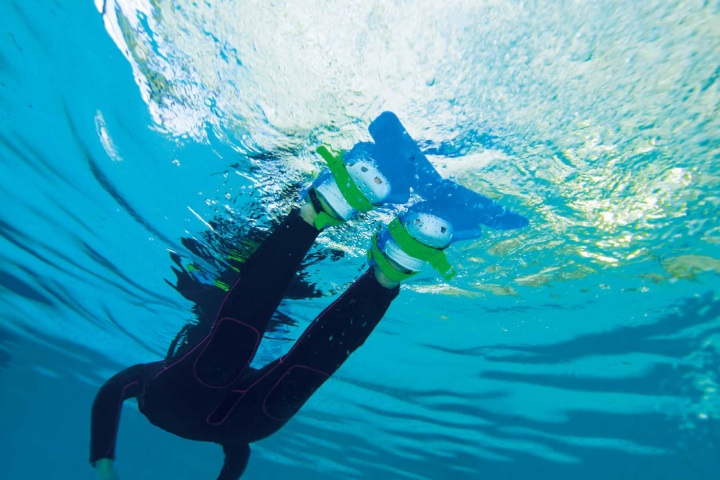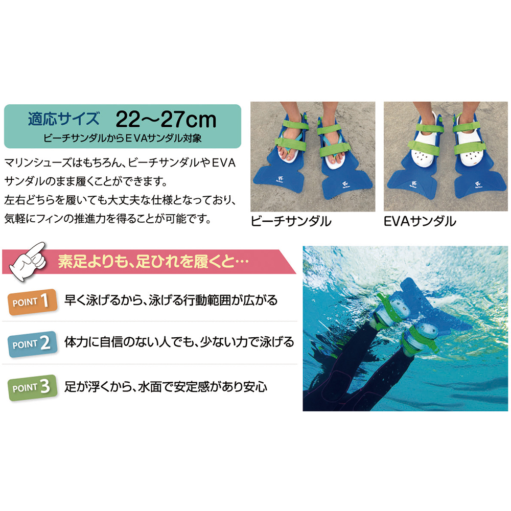 フィンを装着すると、少ない力でより速く広い範囲を泳ぐことができる。またフィンの浮力で足が浮くため、水面での安定感が増して泳ぎやすくなるのだが、着脱が面倒だったり、重くて持ち運びずらかったりするのが難点だった。