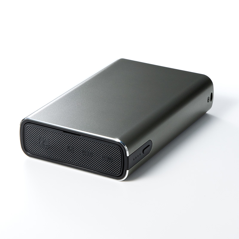 付属の充電用ACアダプタを使用すれば、約3~4時間でモバイルバッテリーをフル蓄電。電源ボタンを押せばLEDが光り、バッテリー残量を確認することができます。100~240V対応で、海外出張にも使えます。