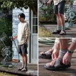 カラー展開は、場所を選ばず使えるBLACKと、テープの光沢感が程よいシックな仕上がりのBROWNの2種類。サンダルといえば、裸足でそのまま履くスタイルが一般的ですが、ソックスと合わせてもピッタリとマッチします。