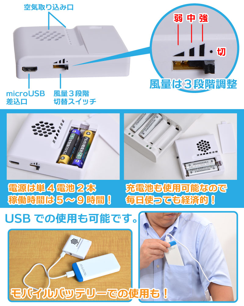 60×65×15mm、30gというミニサイズで、裏側にクリップが付いています。このクリップで袖口に固定してあげれば、側面に開いた穴から空気が送り込まれます。風量も3段階で調整可能。単4電池2本で最大9時間使えます。またmicroUSB端子が付いているので、モバイルバッテリーなどとつなげて使うこともできます。