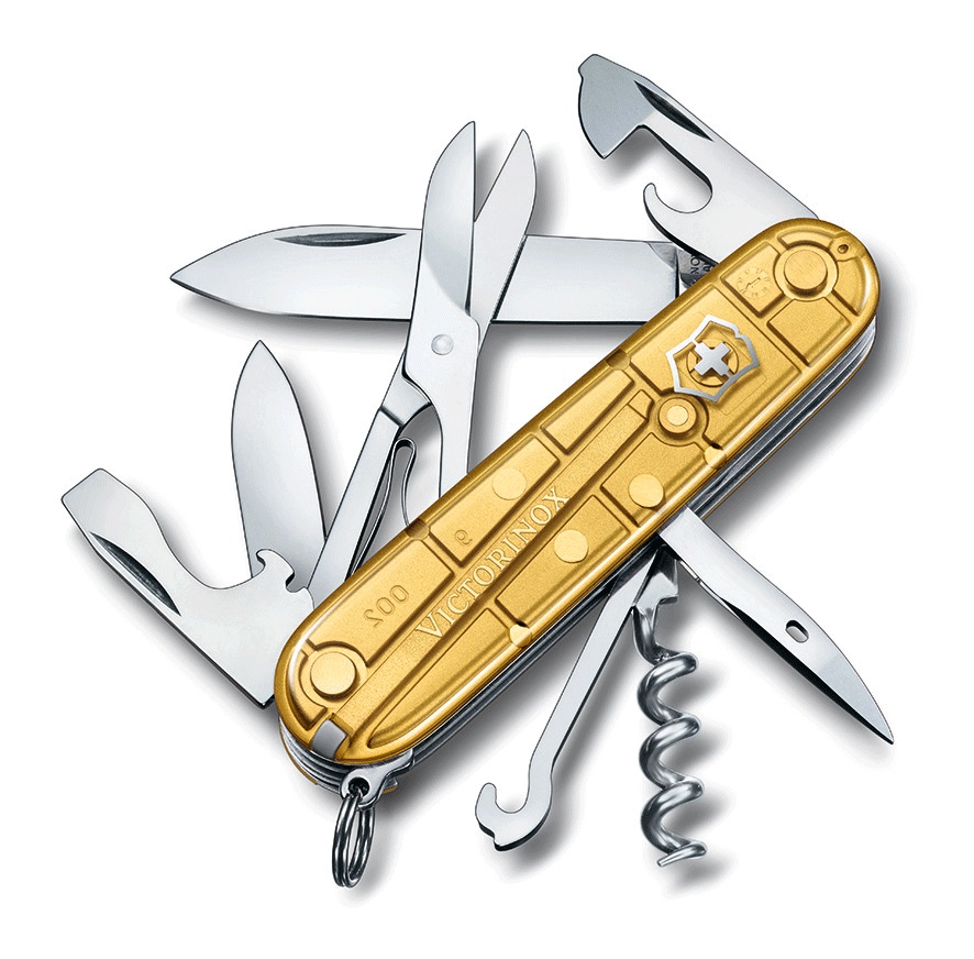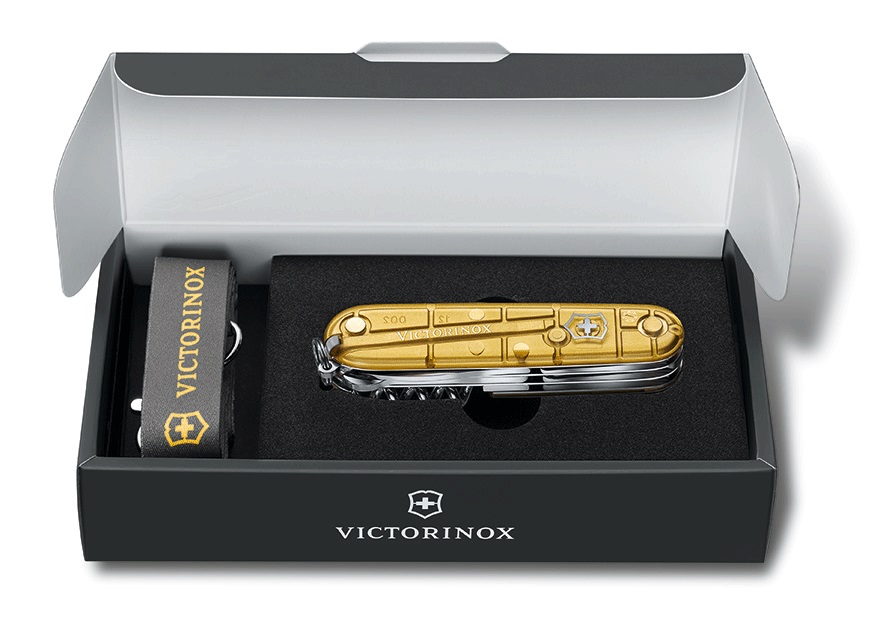 備えるツールは、大小のブレードやマイナスドライバー、缶切り、栓抜き、ハサミなどをはじめとする14種類。ゴージャスな輝きにふさわしい特別デザインのネックストラップが同梱されたスペシャルボックスに収められた限定仕様。
