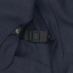 ジャケットの見返し部分に搭載したストラップは、ワンタッチで開閉できるロック式。ジャケットをきゅっとまとめてバッグのハンドルなどに通して掛けることができ、ハンズフリーでジャケットを持ち歩けます。