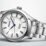 その柔らかい窪みが生み出す陰影と白磁の艶めく光沢とが絶妙なコントラストを成し、そこに配された青いインデックスと針、そしてSEIKOの文字などが彩りをプラス。その美しいダイヤルを覆う内面無反射コーティングを施したデュアルカーブサファイアガラスは、レンズ効果がなく、あらゆる角度から時刻を読み取りやすいのが特徴です。