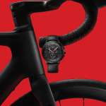 アスファルトの質感を感じさせる文字盤、ストラップがブラックカラーで統一され、自転車型の秒針&リューズのカラーがモデルごとに異なっています。