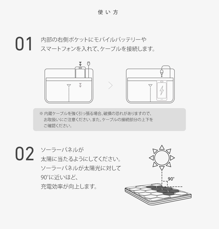 直射日光の下であれば、約8時間でバッテリー容量2550mAhのスマートフォンがフル充電できるので、モバイルバッテリーを持ち歩く必要もなくなります。