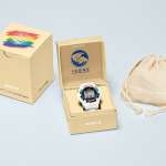 環境への配慮として、蛍光灯などのわずかな光でも駆動し、定期的な電池交換の不要な“タフソーラー”を搭載。また、パッケージには再生紙を使用した専用のボックスとコットン100%の巾着袋が採用されているなど、細部にまでサスティナブルなこだわりが感じられます。