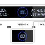 出力ポートは前面にUSB-A×2、USB-A(QC 3.0)×2、USB-C(PD100W)×2の計6口、側面にAC出力(コンセント)×3と豊富に搭載。LCD画面でバッテリー残量やポートごとの使用電力状況などが表示されるので安心です。
