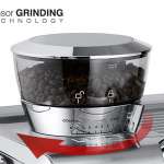 豆を挽くグラインダーは8段階の粒度調整が可能。ホッパーに豆を入れておけば、あとは粒度と量を選んでボタンを押すだけで、正確な量のコーヒー粉を作ってくれます。