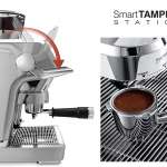 コーヒー粉ができたら次はタンピングの出番。タンピングとは、挽いたコーヒー粉を一定の圧力で押し固める作業で、エスプレッソでは味を決める重要な工程。キレイに仕上げるにはコツのいるタンピングも、このマシンならサイドのレバーを下ろすだけで均一に押し固められます。