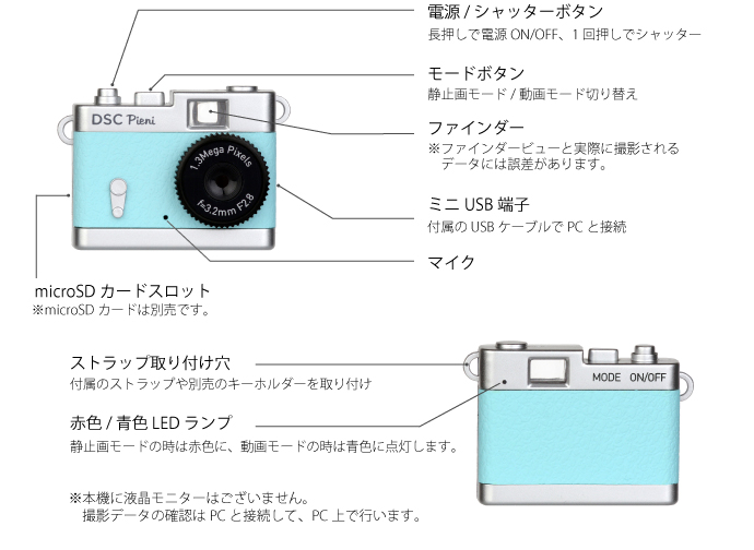 内蔵メモリはなく、外部記憶媒体として別売のmicroSD/SDHCを用いる。静止画のほか音声付きの動画も撮影可能。画像データの取り込みや充電は付属のUSB接続ケーブルでパソコンに接続して行う。本体には液晶モニターを搭載しないため、どう写っているかはパソコンで確認してのお楽しみだ。
