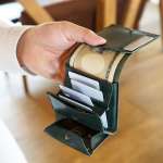 カラーリングはブラック、ダークグリーン、ライトブラウン、マスタードの全4色。キャッシュレス時代の財布に求められる機能性と、古くからの技術によるエイジングの楽しみを兼ね備えたミニ革財布に要注目です。