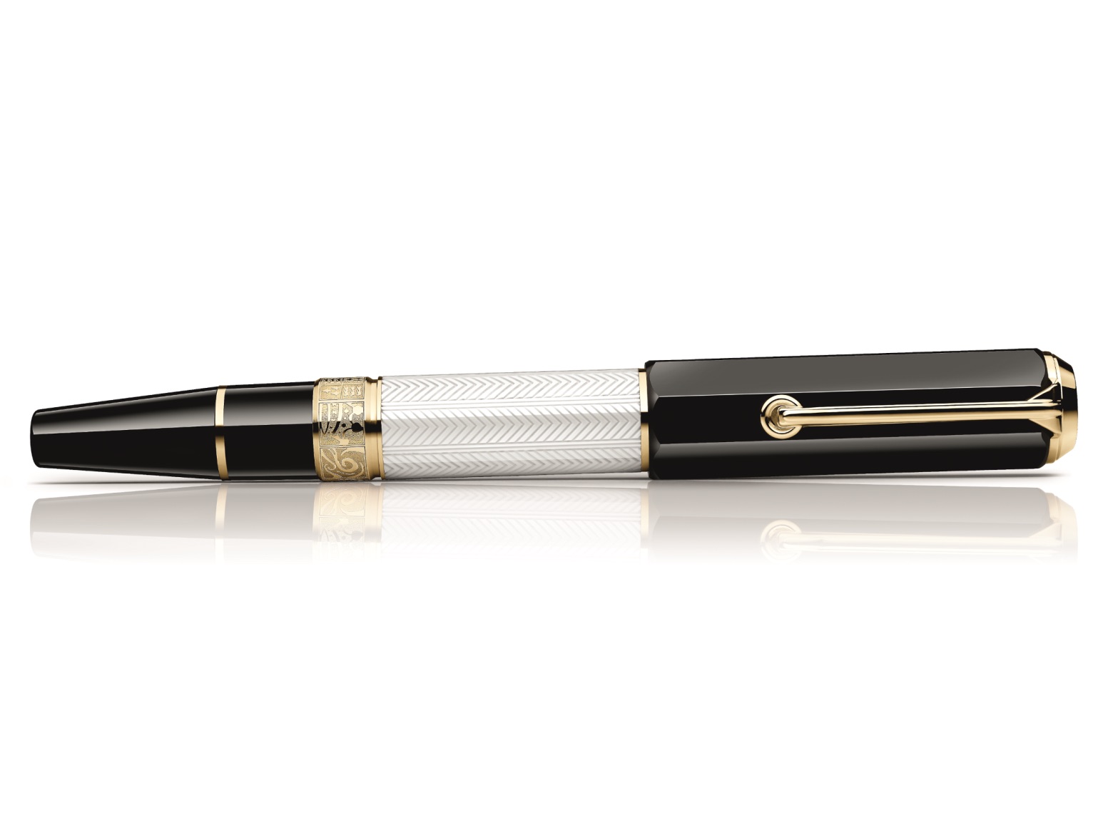 また、ボディ回りの金色のリングには7つの代表作をデザイン。「ロミオとジュリエット」の薔薇と短剣立て、「ハムレット」の髑髏、「リア王」 の2つのチェス駒、「ヘンリー5世」の兜、「マクベス」の王冠、「テンペスト」の渦巻く雲、そして「ジュリアス・ シーザー」のC字を象った月桂冠がシンボライズ。細部にまでシェイクスピアへの畏敬の念と職人の技が詰まっています。