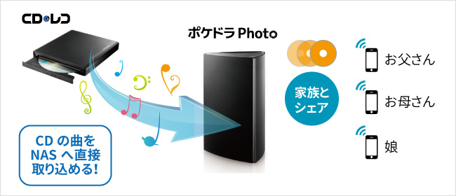 そもそもはハードディスクである「ポケドラPhoto」。当然、活躍の範囲は画像、動画の保存だけにとどまりません。CDの内容を音楽データにしてスマホに直接保存できる「CDレコ」を使えば、「ポケドラPHOTO」に直接音楽データを保存できたり、パソコンと接続することで大容量クラウドストレージとして活用したりもできます。