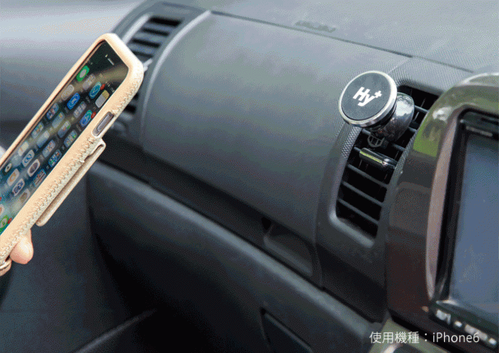 位置は中央上寄り。エアコン吹き出し口に付けられる別売りの「マグネット車載カーマウントホルダ」(980円)を車内に設置しておけば、ピタッとケースを付けたままでくっついてくれる。強力な磁力なので落ちる心配もなし。これなら、車内でのiPhoneの置き場所に困ることもないし、片手で楽々くっつけられる。