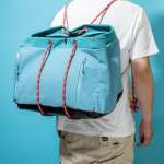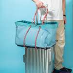 アジャスターによって手持ち(トートバッグ)とバックパックにスタイルを切り替えられ、さらに本体側面に配されたキャリー固定用ベルトを噛ますことでキャリーオンバッグとしても使用が可能。使い分け自在の3WAY方式となっているのも、このバッグの魅力的なポイントといえるでしょう。カラーはサーフブルー、サーフピンク、マットカーキ、マットブラックから選択できます。