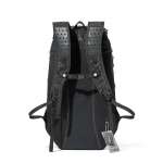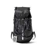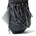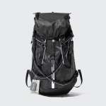 登山用バックパックをスタイリッシュに昇華したデザインが印象的で、目を引くのが、ブラックにホワイトのラインが入ったフロントの2本のテープ。このテープがゆるやかなラインを描きながらアシンメトリーに交差し、個性をプラスしています。