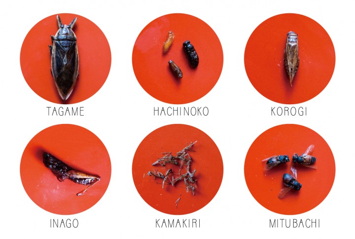 タガメのせ卵焼き、ハチノコ軍艦、コオロギ寿司、イナゴ寿司、カマキリのサラダ巻き、ミツバチ軍艦の6貫セット。それぞれの特徴を生かして6種の昆虫を寿司仕立てに。