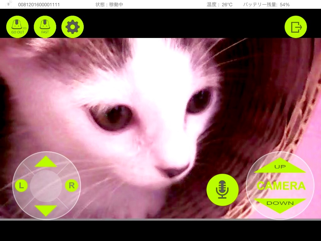 本体の操作は、まるでラジコン。スマホの画面に出てくるコントローラーをタッチして動かします。また内蔵カメラを上下に動かすこともできるので、床で動いている本体からでも鍵のかけ忘れを確認もできるんです。