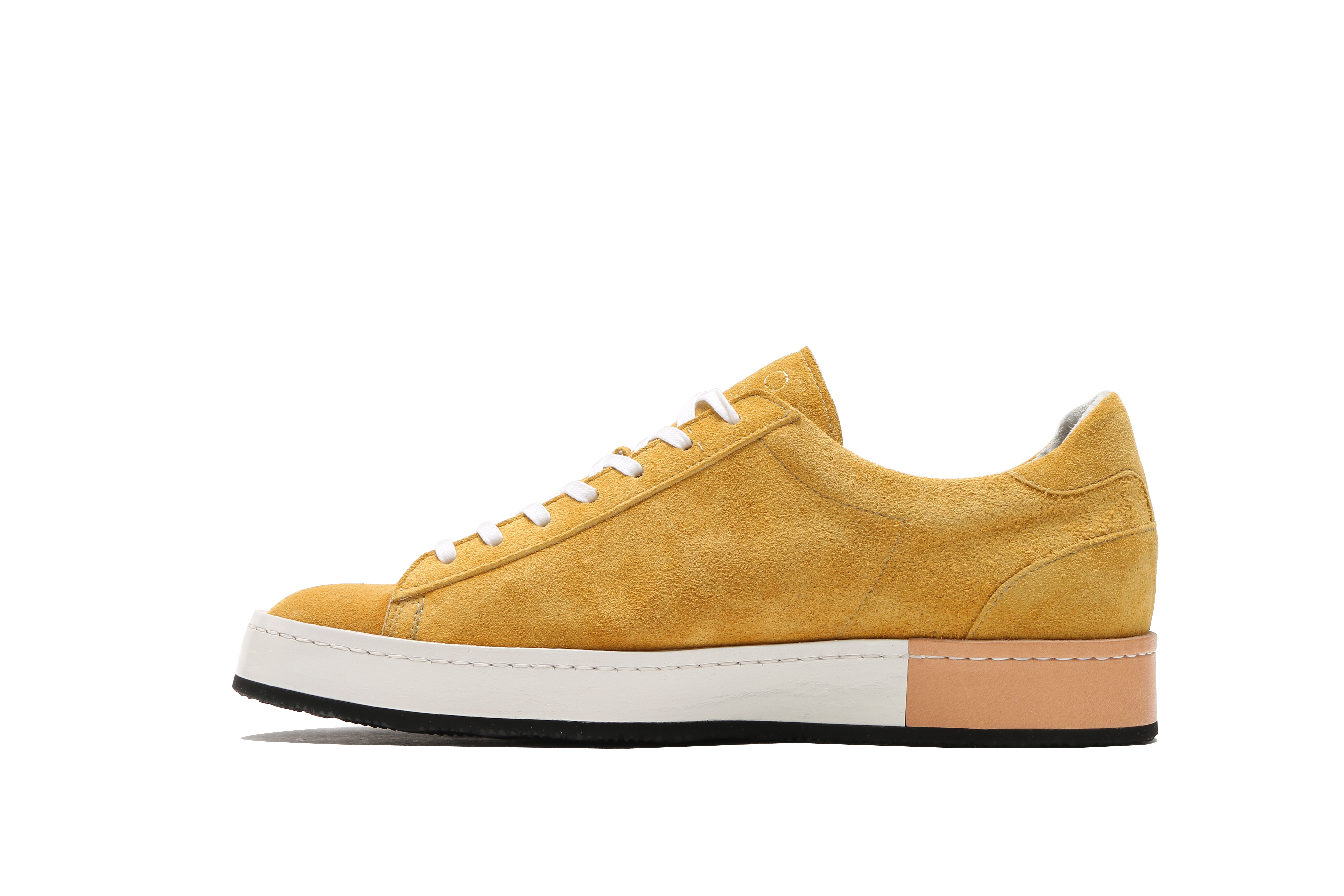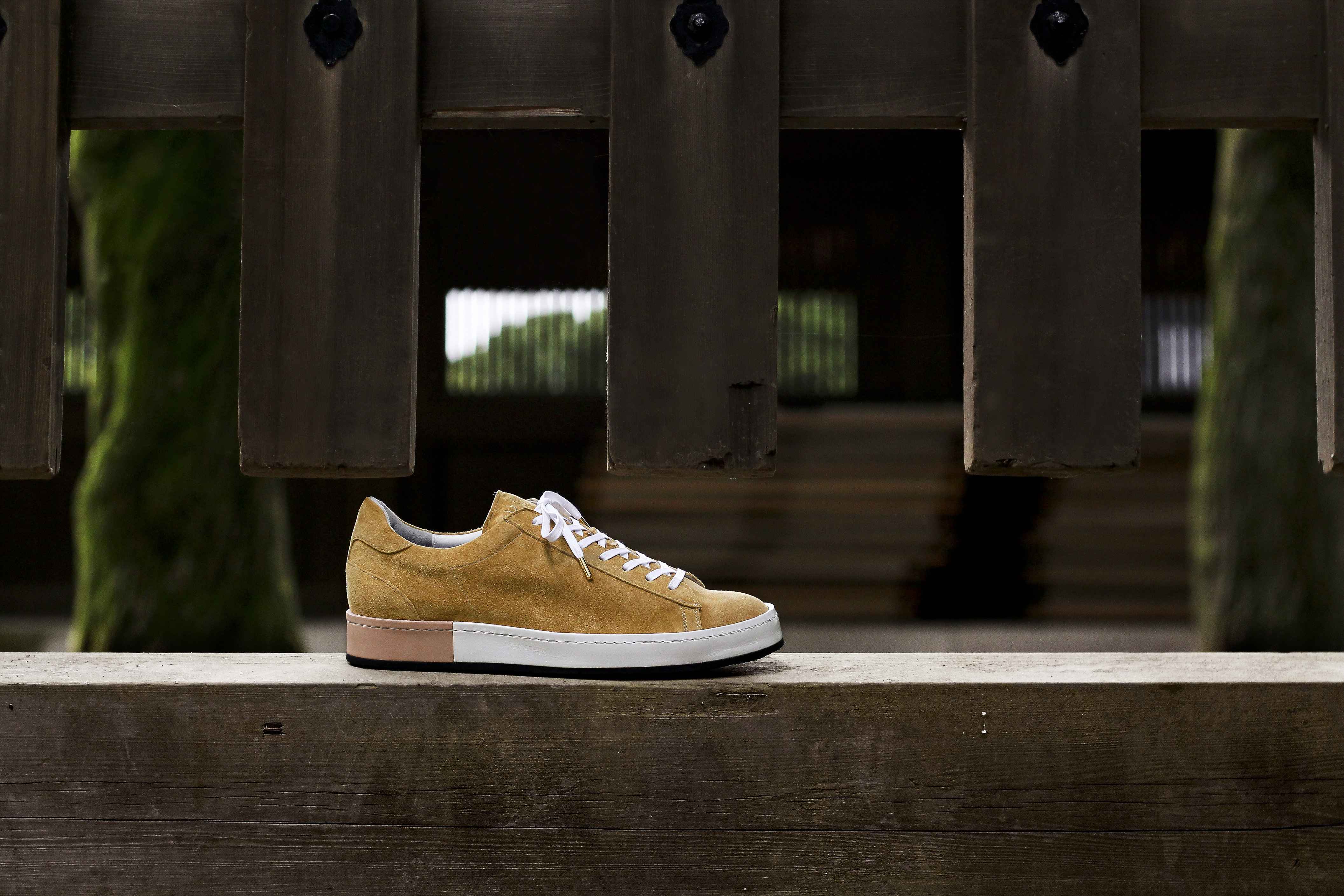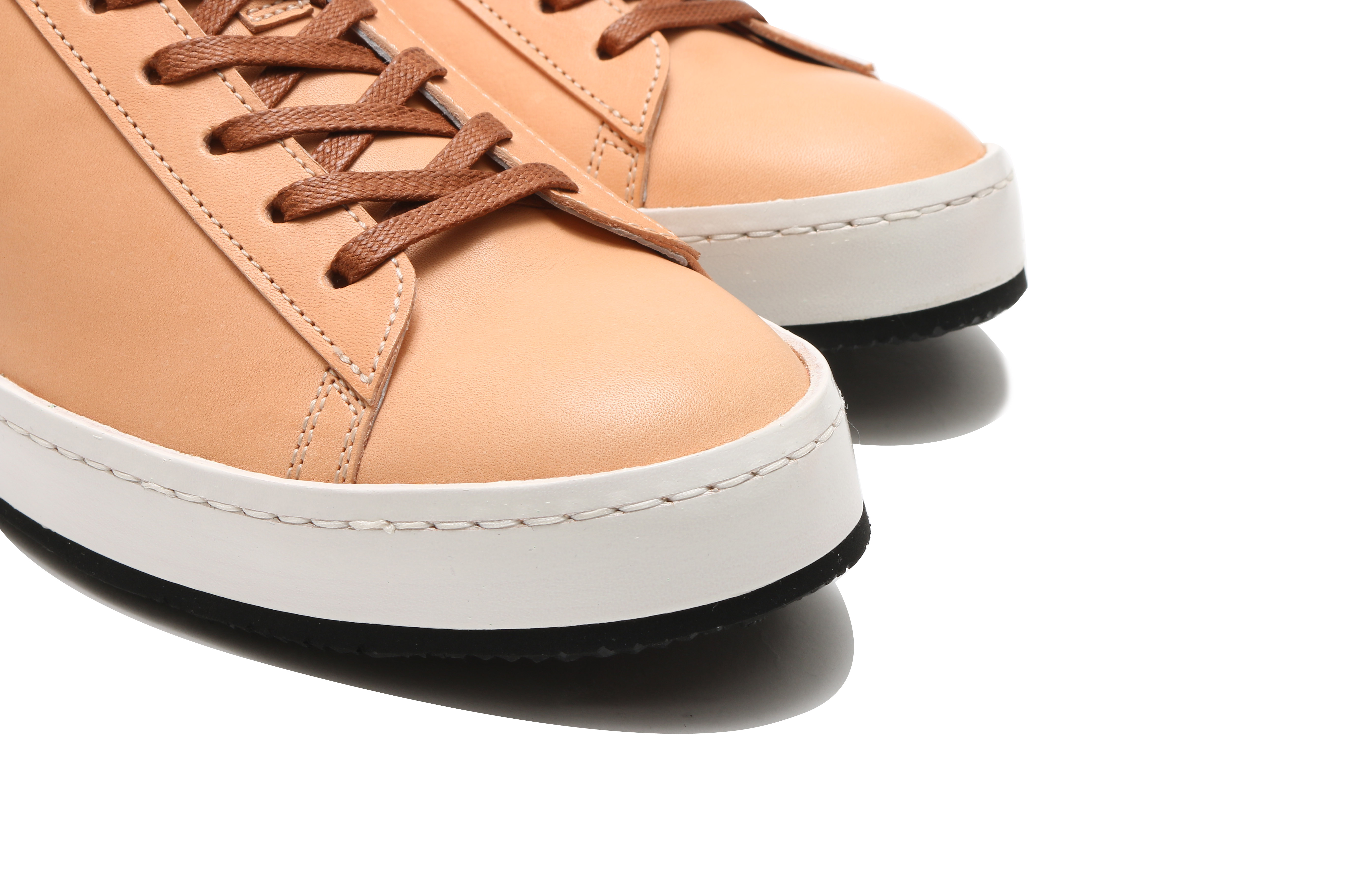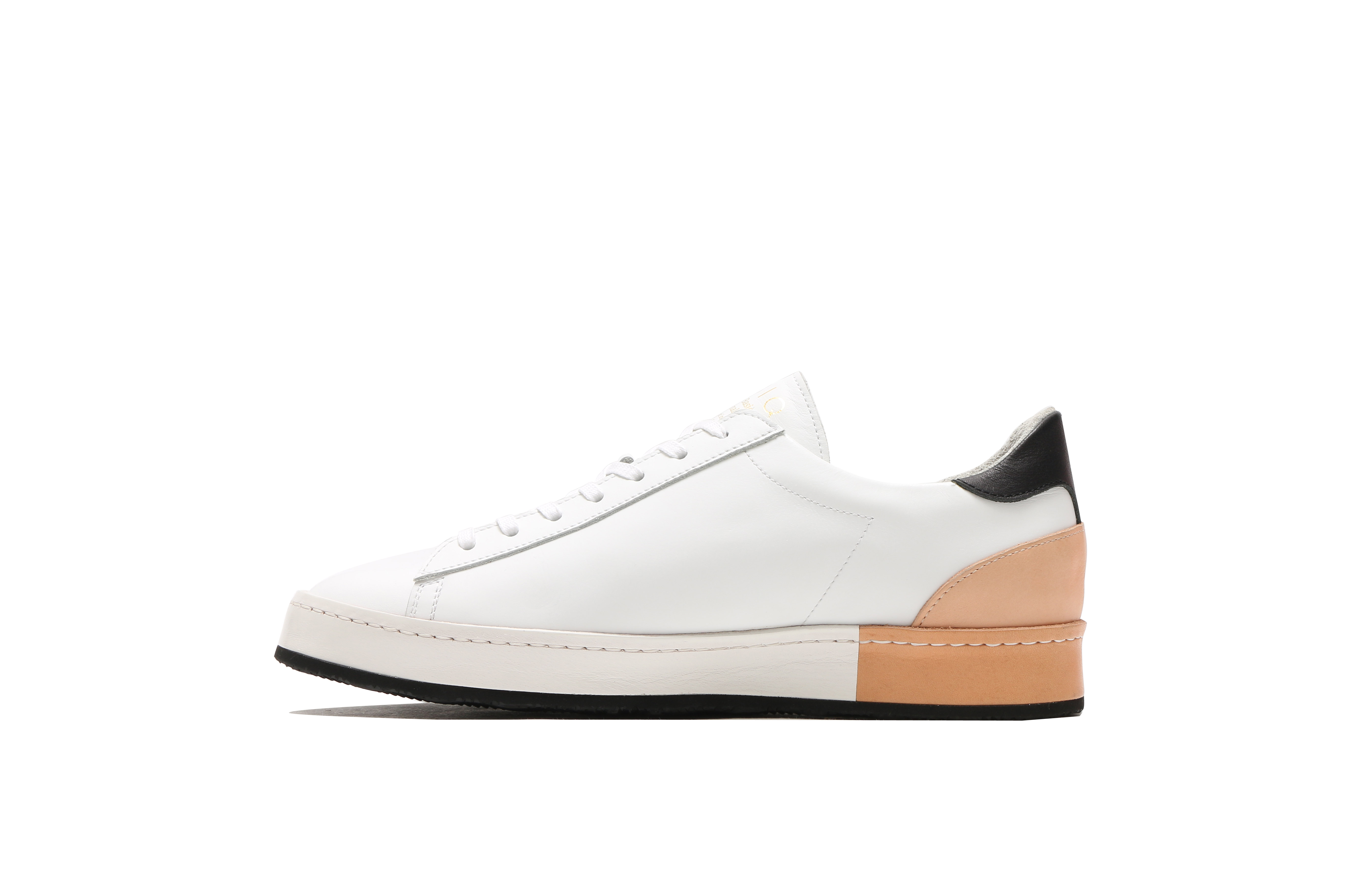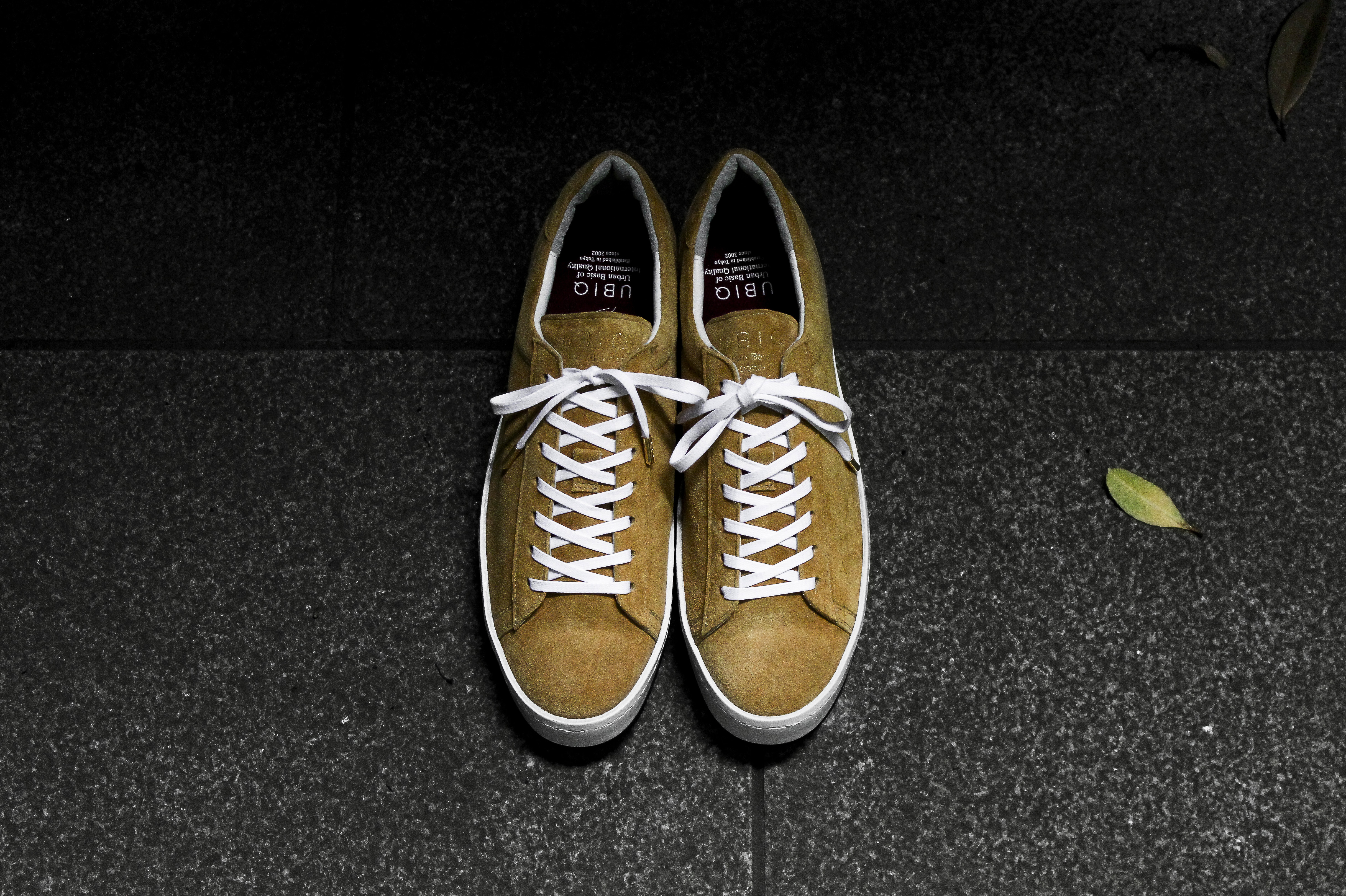 東京下町の職人の技術を用いてひとつひとつ丁寧に仕上げられたシューズは、いわゆるスポーツスニーカーとは一線を画した上品な仕上がり。アウトソールにはビブラムソールを採用、ヒール部分に施されたナチュラルカラーのレザーが軽やかな印象を与える。