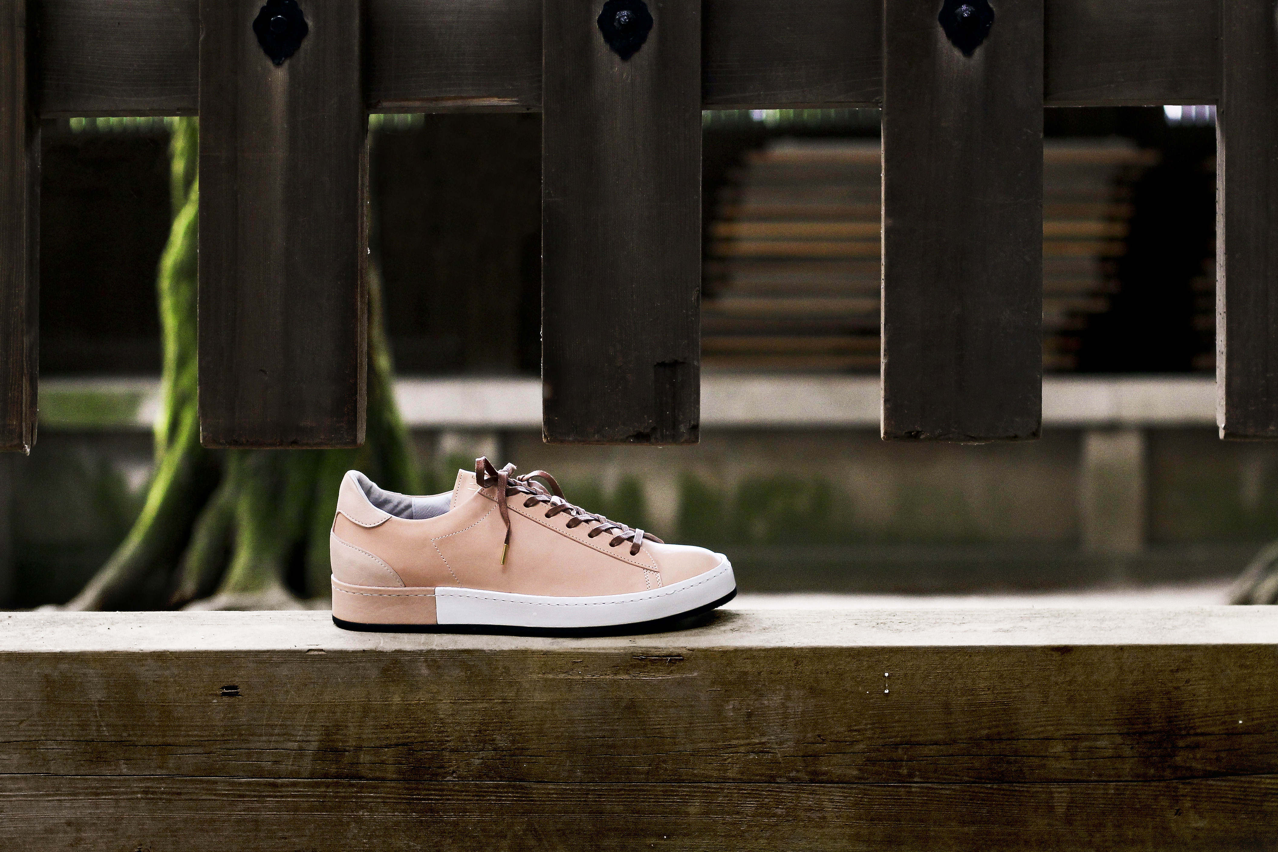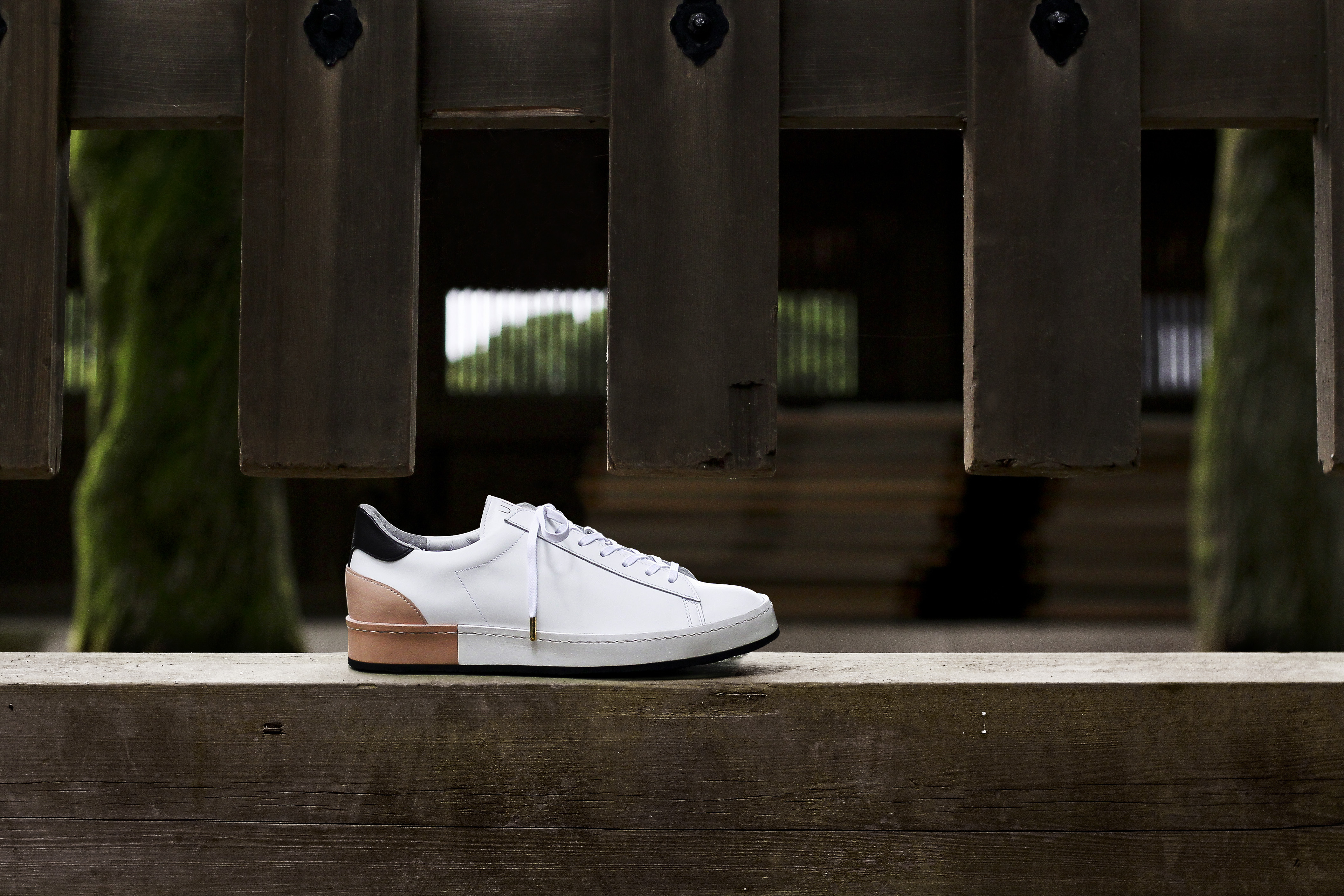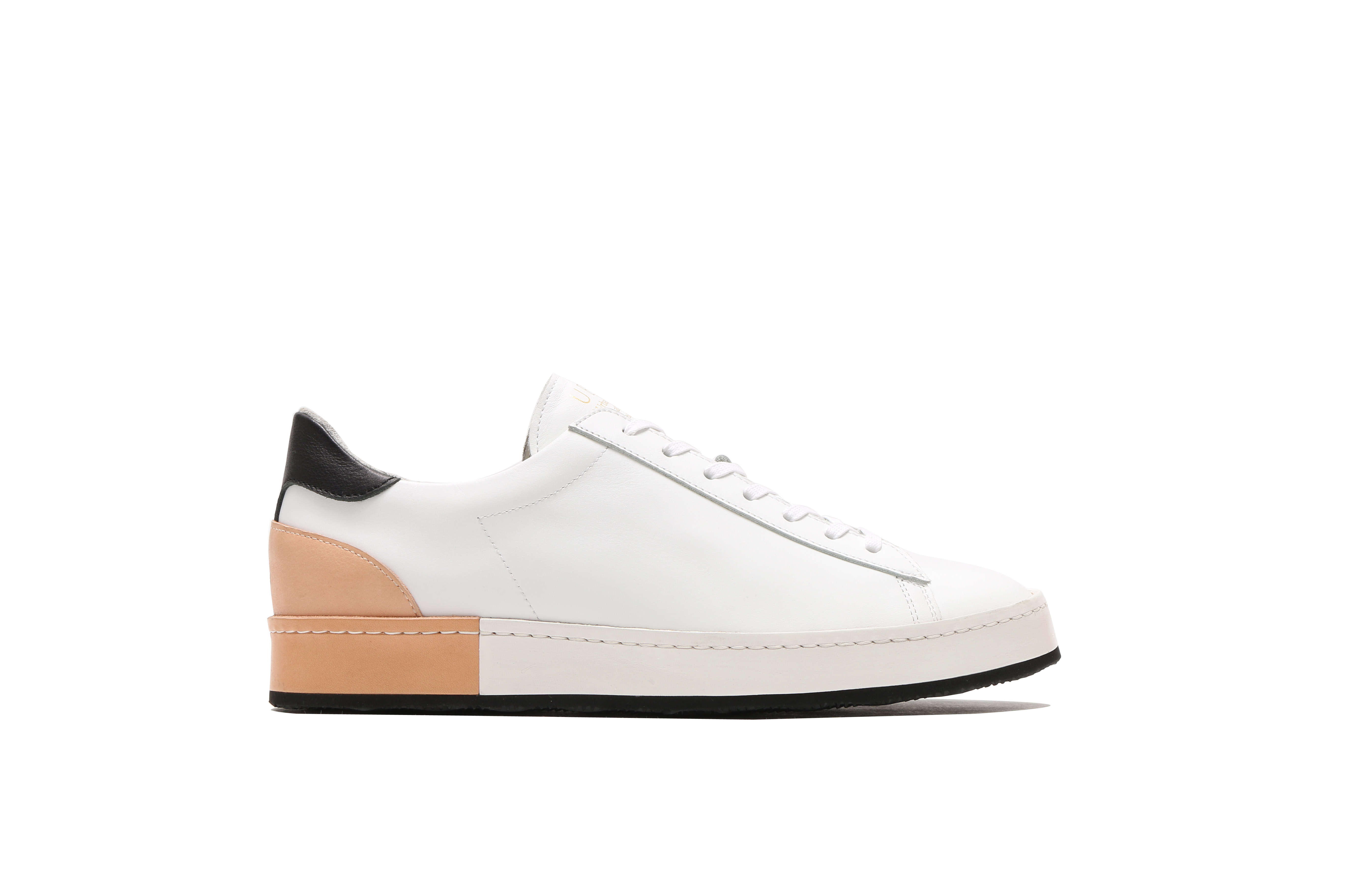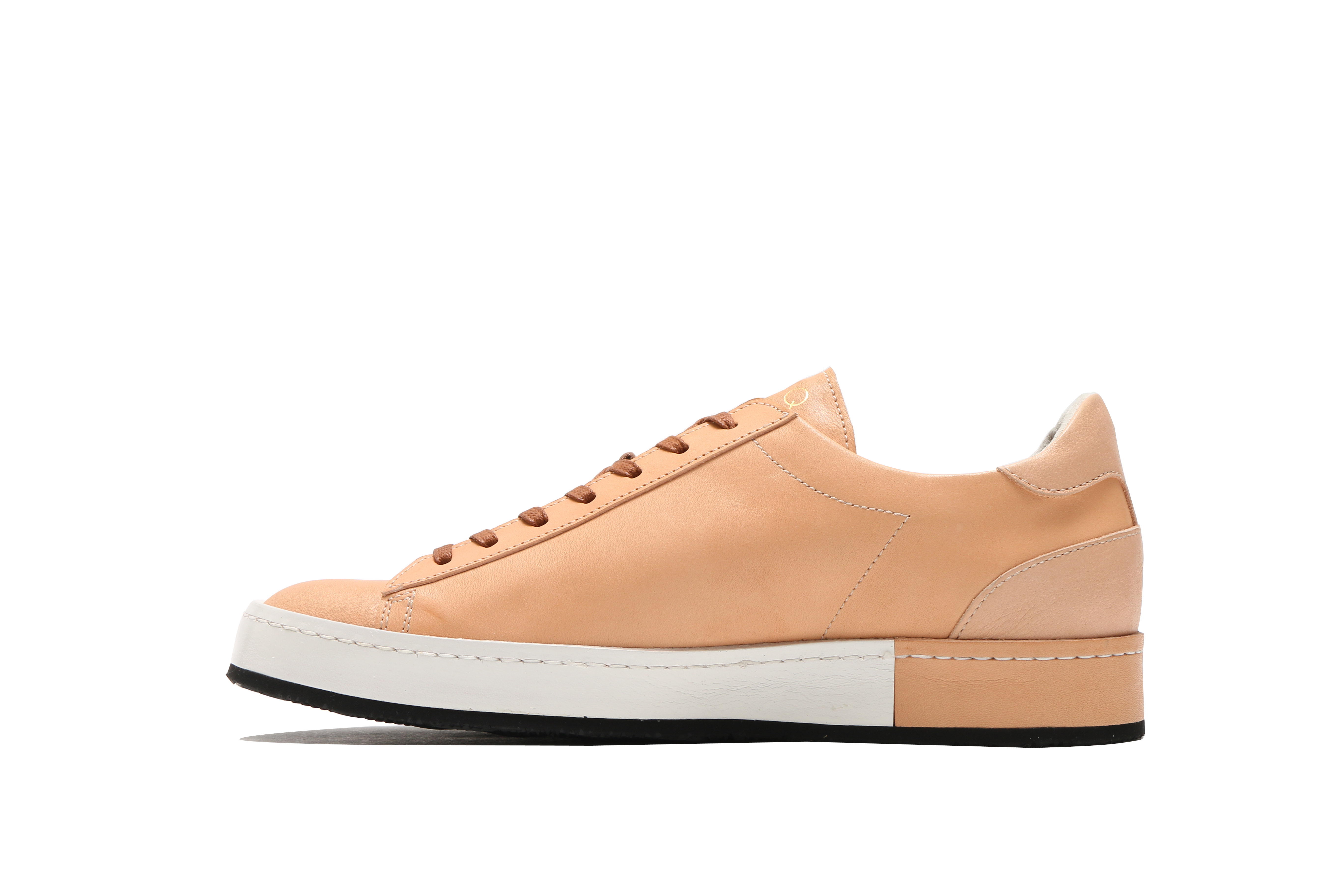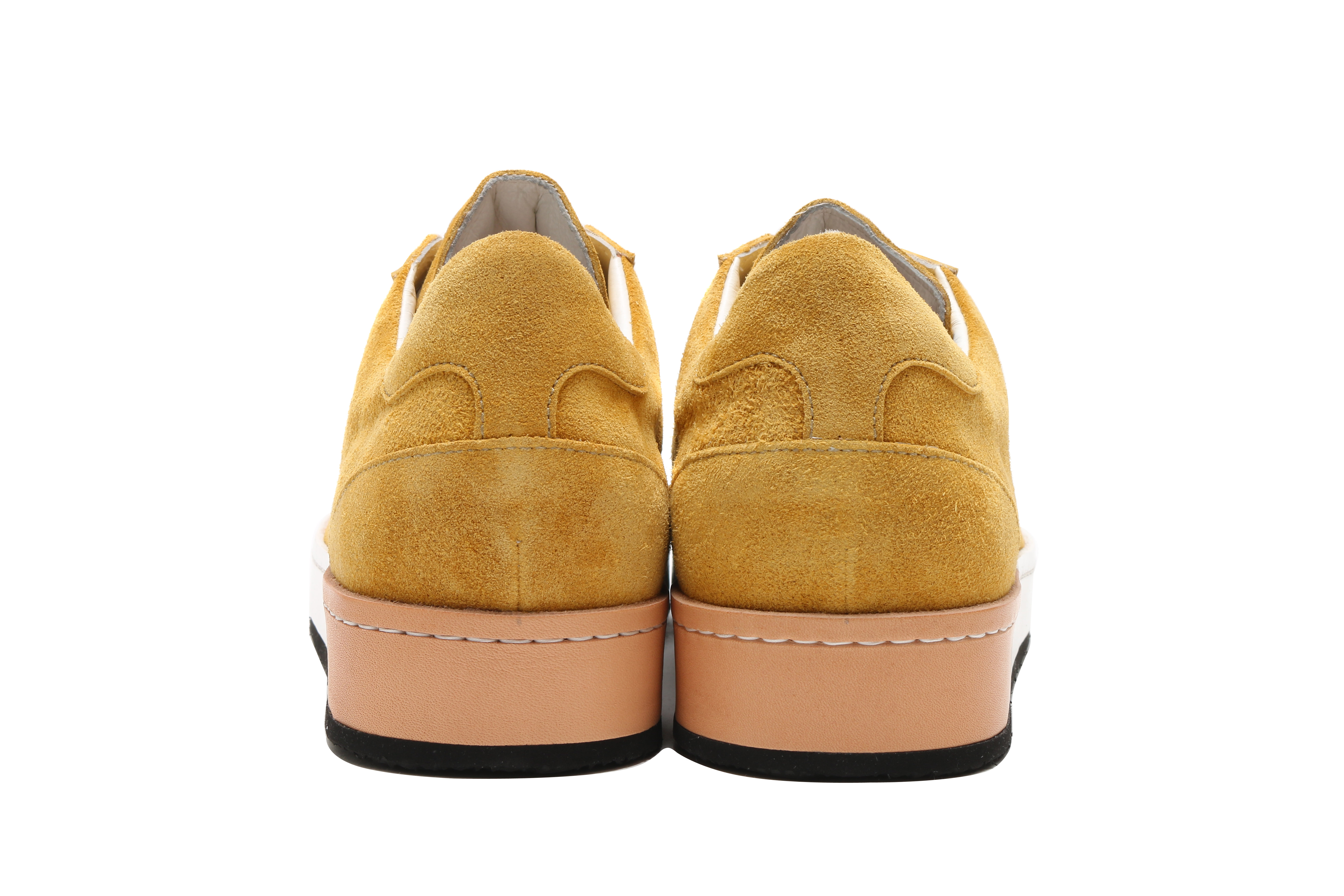 東京下町の職人の技術を用いてひとつひとつ丁寧に仕上げられたシューズは、いわゆるスポーツスニーカーとは一線を画した上品な仕上がり。アウトソールにはビブラムソールを採用、ヒール部分に施されたナチュラルカラーのレザーが軽やかな印象を与える。
