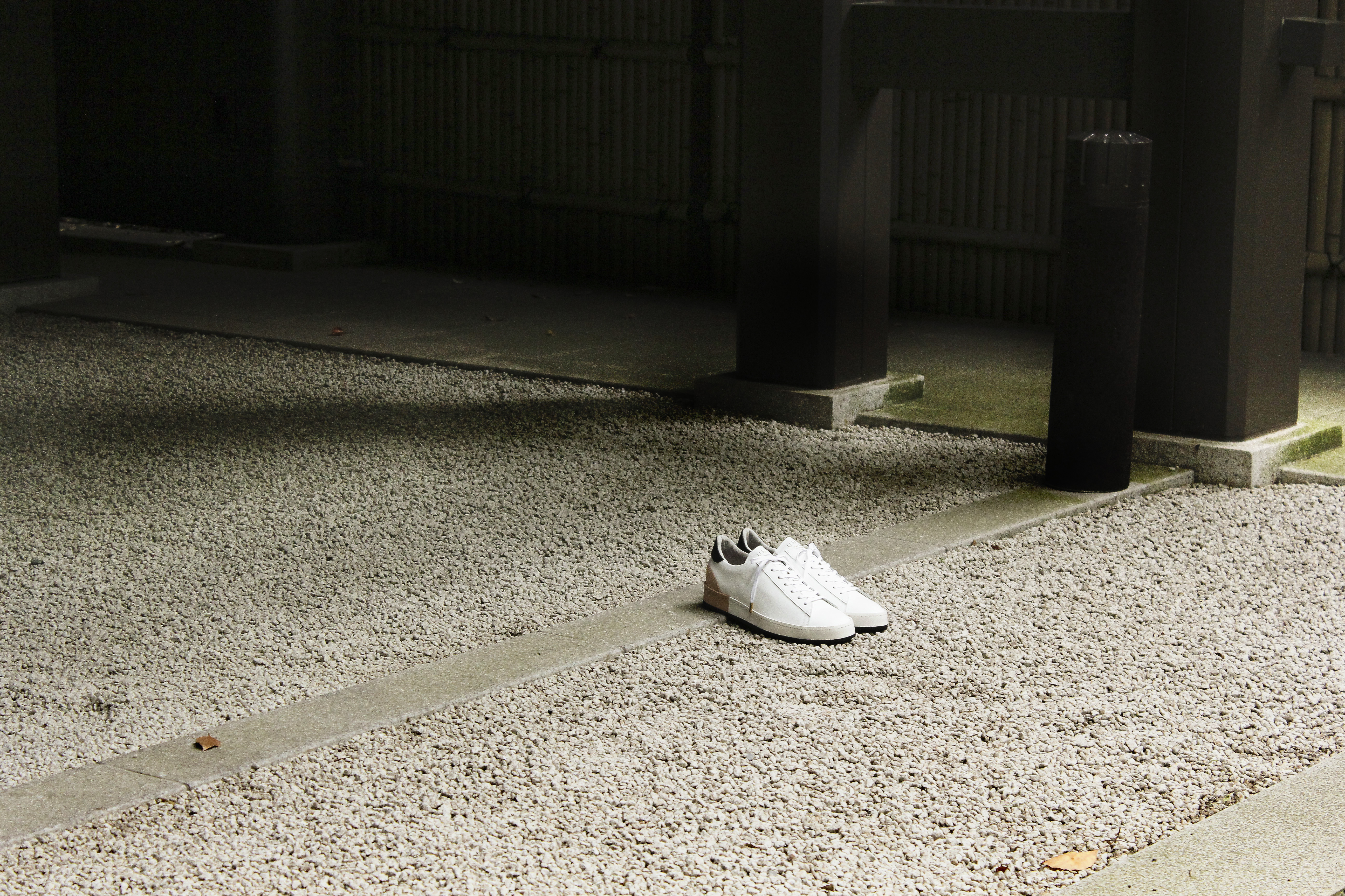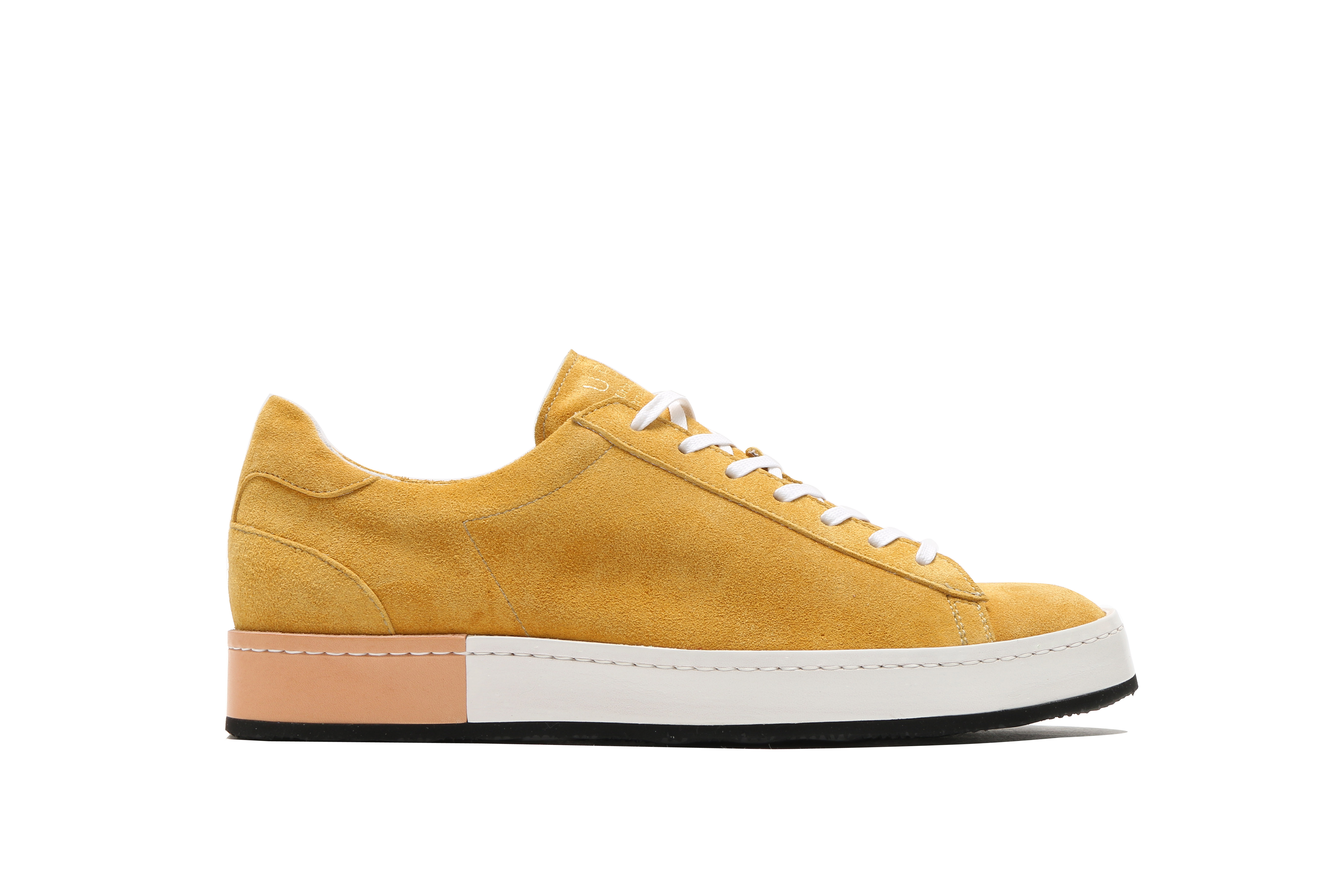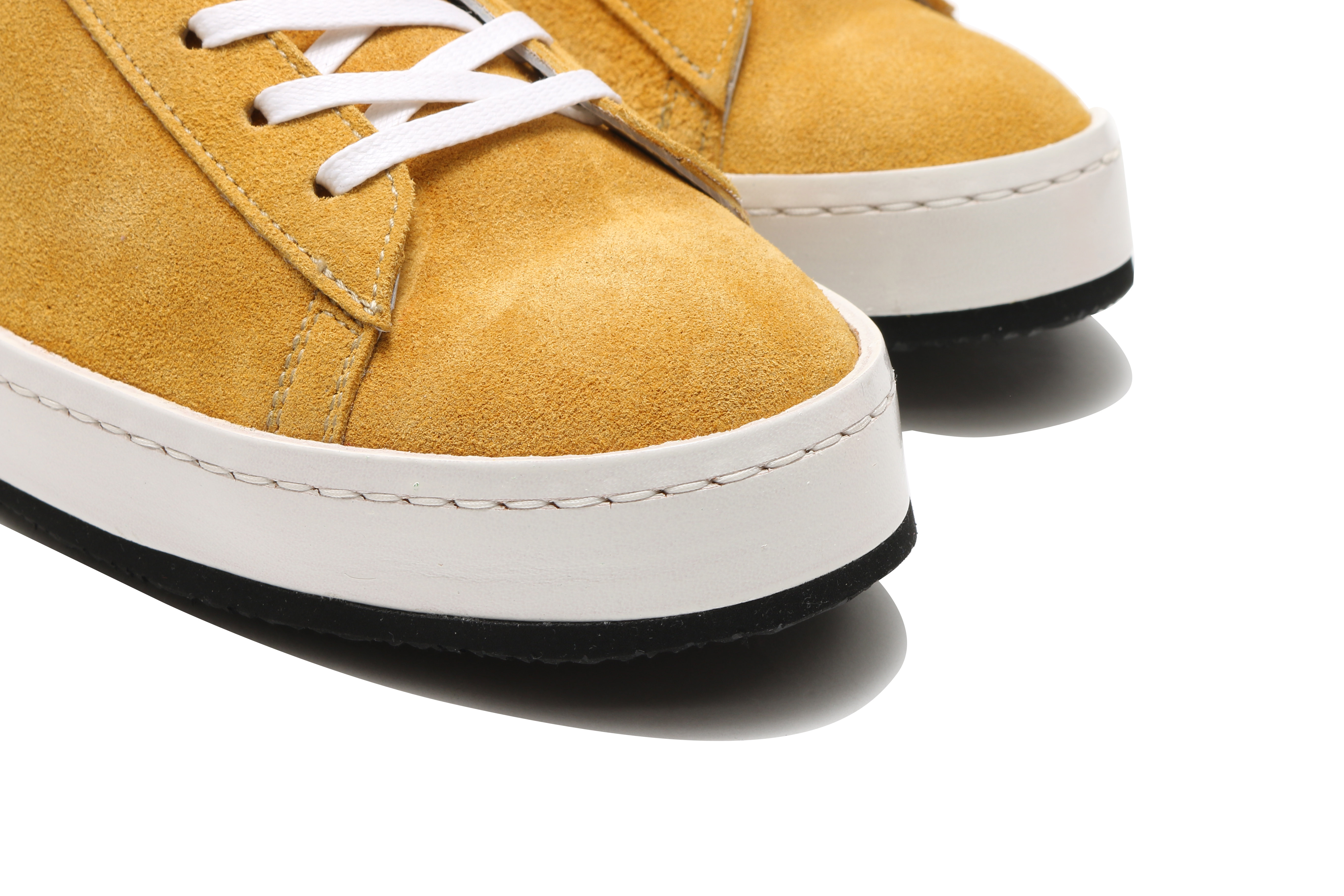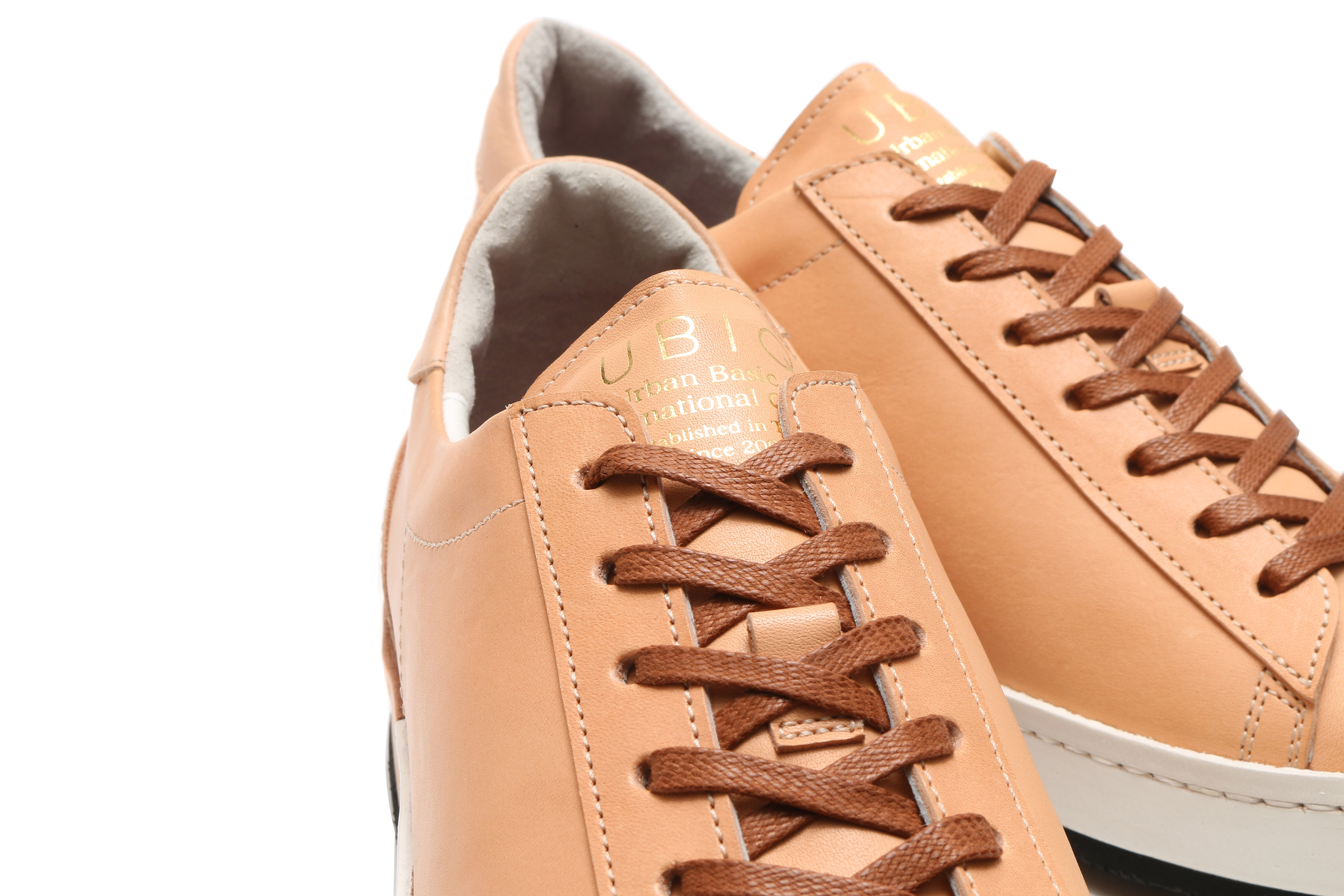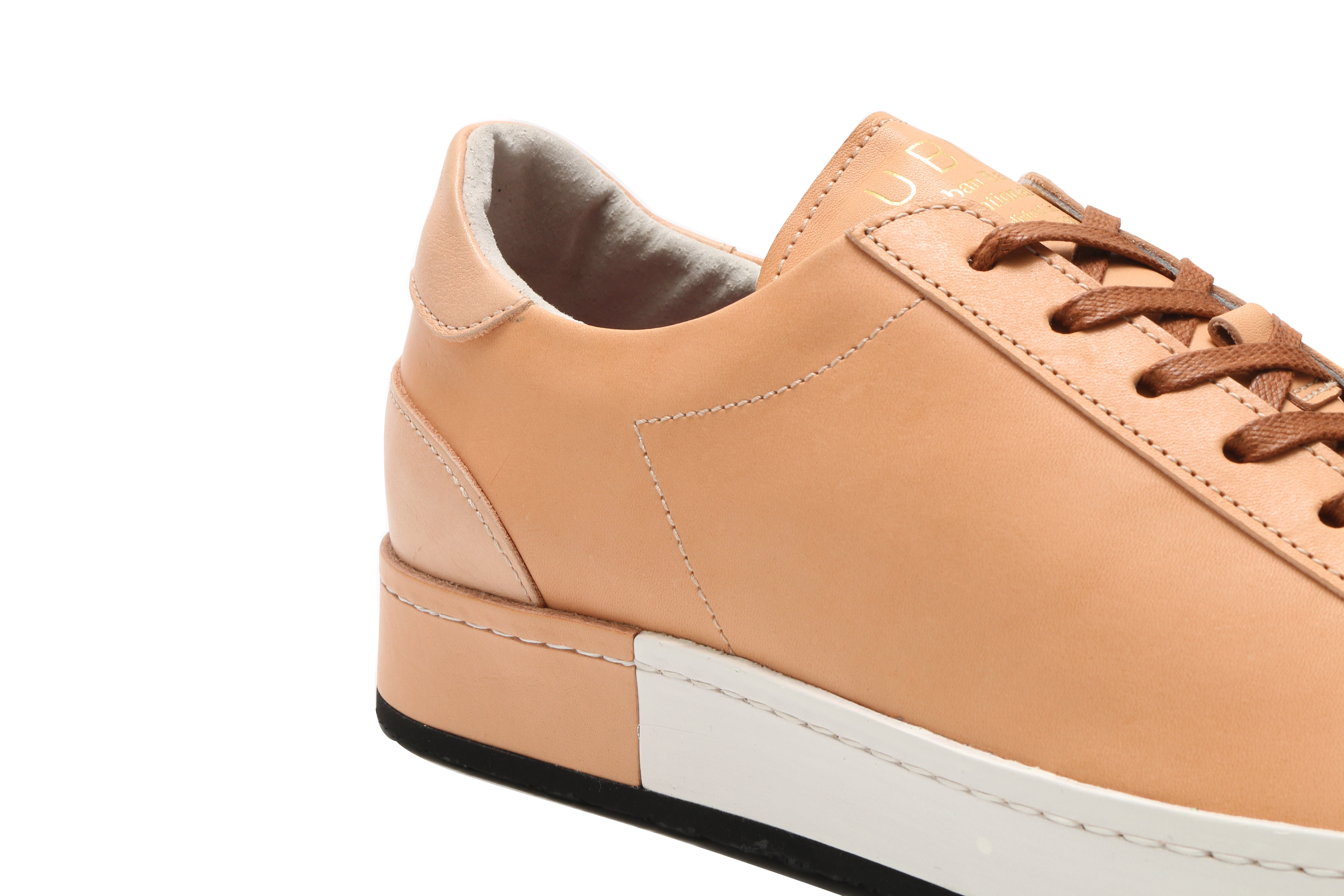 東京下町の職人の技術を用いてひとつひとつ丁寧に仕上げられたシューズは、いわゆるスポーツスニーカーとは一線を画した上品な仕上がり。アウトソールにはビブラムソールを採用、ヒール部分に施されたナチュラルカラーのレザーが軽やかな印象を与える。