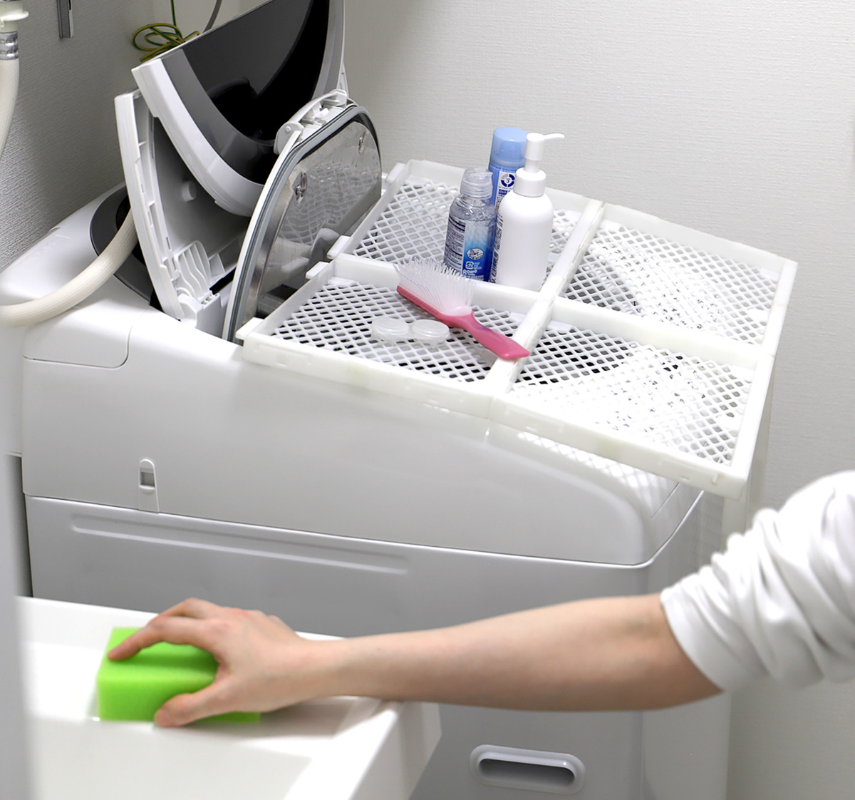 しかし、思わぬところにデッドスペースを発見! それはなんと洗濯機の上。Makuakeで先行販売中の「さいちくん」(3598円~ 8月1日現在)は、洗濯機のフタに磁石で取り付けられる簡易的な棚。どう使うのか…実に気になる!