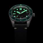 シンプルなデザインのインデックスと時分秒針、グリーンベゼルの「0」の位置には、発光量が大きく、また長時間に渡って光を放つスイス製のスーパールミノバを塗布。日中はもちろんのこと、夜間暗所でも抜群の視認性が確保されています。
