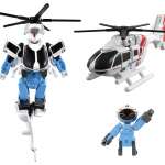 製品に同梱されているのはアーマートミカと呼ばれる乗り物(今回はヘリコプター)と、ジョブロイド(おしごとロボ)。アーマートミカを分解・変形させて、ジョブロイドと合体させることでジョブレイバーへと変身します。