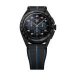 カーボン調のブラックカーフスキンにブルーのステッチを入れたストラップも、ポルシェの車両内装に使われているレザー仕上げを思わせるもの。裏面にはラバー製のベースを施して、快適な装着感を実現しています。さらにスペアとしてブラックラバーのストラップを同梱。シーンや装いに合わせて付け替える楽しさを味えます。