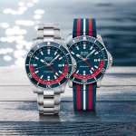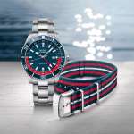 サテン仕上げのステンレススティール製ブレスレットは、ダイビング用エクステンションを装備。さらに、よりスポーティな印象の青・赤・白のストライプデザインが施されたファブリックストラップが同梱されており、工具なしで簡単に付け替えられます。