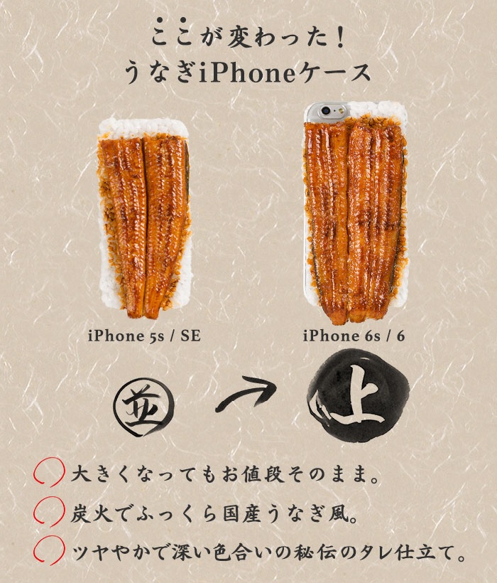 iPhone5対応の旧モデルに対して新作Phone 6s/6対応モデルは、うなぎのボリューム2割増でお値段据え置き、上うなぎ重として考えたらかなりお安めの4104円。Hamee本店および同社運営の各ECサイト通販サイトで7月22日より発売中。