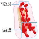 搭載されるもみ玉は合計14個。このうち、上部のふたつと、腰のあたりの6つは立体的に動く3Dもみ玉。上下左右だけでなく前後にも動くため、体の曲線に合うマッサージとなることで、より深いもみ心地を実現。
