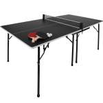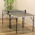 組み立てはフレームを広げてサポート部分を接続し、卓球のネットを取り付けるだけのシンプル構造。天板がふたつに分離するので持ち運びにも便利。また、ネットがひとつ、ラケットがふたつ、ボールが3つセットになっているので、ラケットやボールを用意することなく、すぐに卓球を楽しめます。