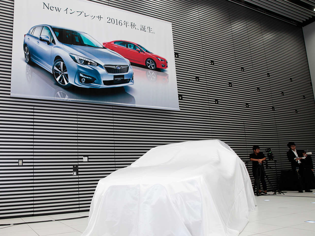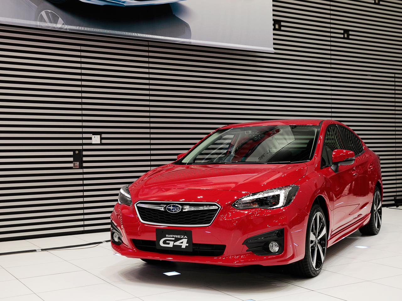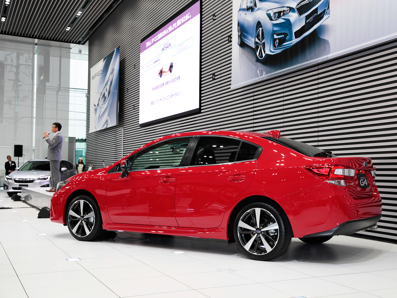新開発の“スバル・グローバル・プラットフォーム”を用いた、その第1弾となる新型インプレッサ。会場となったスバルスタースクエア(東京・恵比寿)には、ピュアレッドのセダン「インプレッサ G4」と、アイスシルバー・メタリックにペイントされたハッチバック「インプレッサ スポーツ」が展示され、あっという間に報道陣に囲まれました。