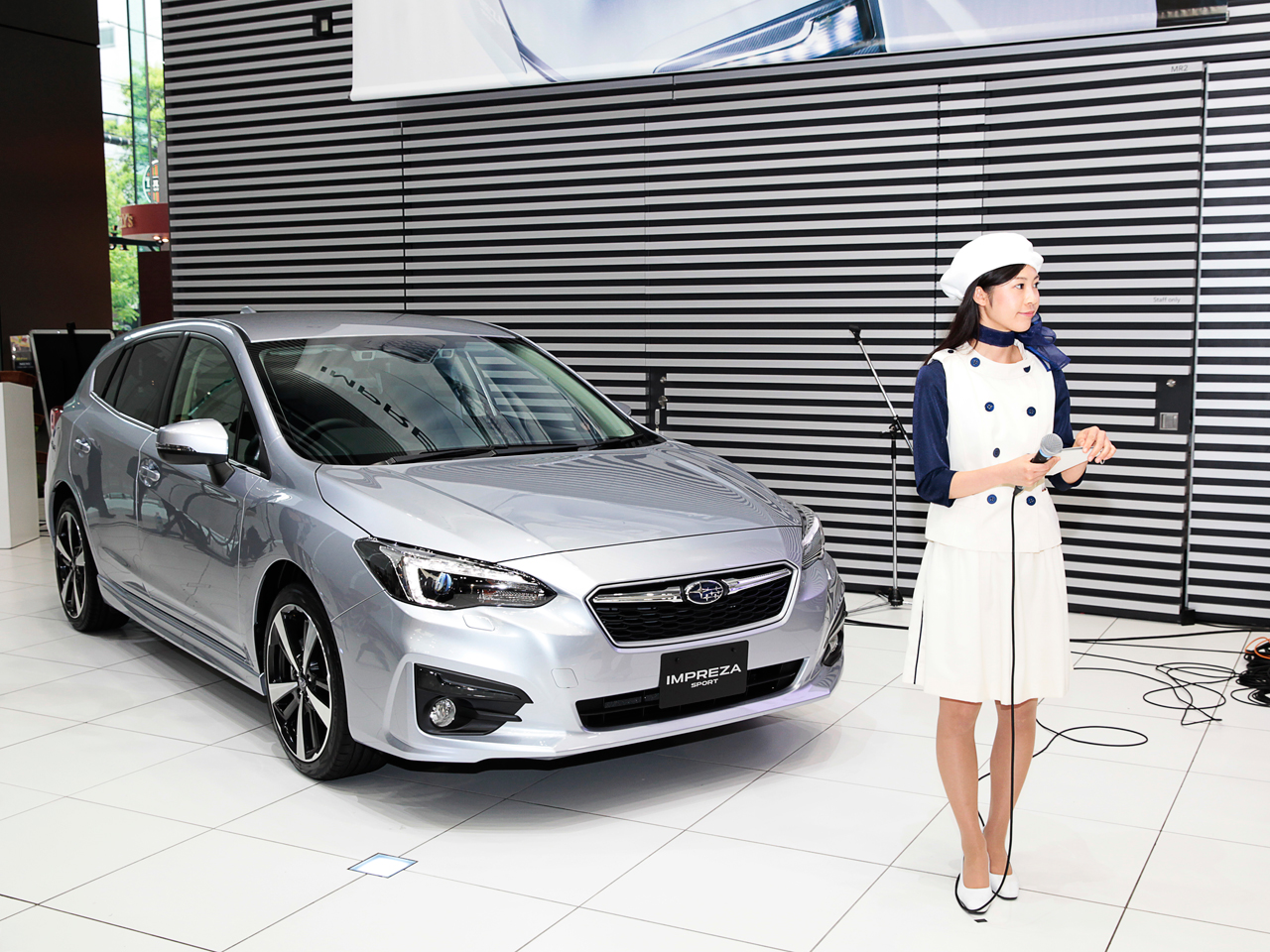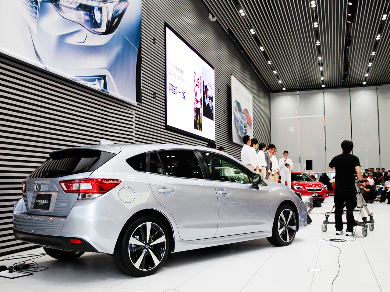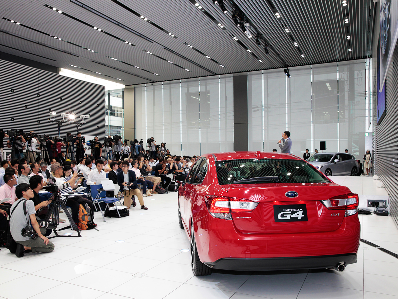 新開発の“スバル・グローバル・プラットフォーム”を用いた、その第1弾となる新型インプレッサ。会場となったスバルスタースクエア(東京・恵比寿)には、ピュアレッドのセダン「インプレッサ G4」と、アイスシルバー・メタリックにペイントされたハッチバック「インプレッサ スポーツ」が展示され、あっという間に報道陣に囲まれました。