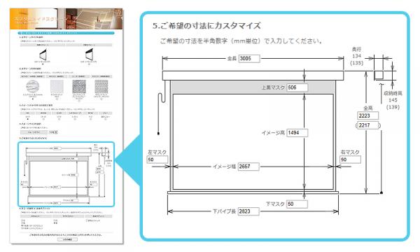 「カスタムメイドスクリーン」はその名の通り、スクリーンを簡単に設計できるシステム。生地、本体部分のサイズやマスク幅、高さ、電動か手動か、などの条件を入力すると、システムが自動計算してくれ、理想的なスクリーンを設計できます。