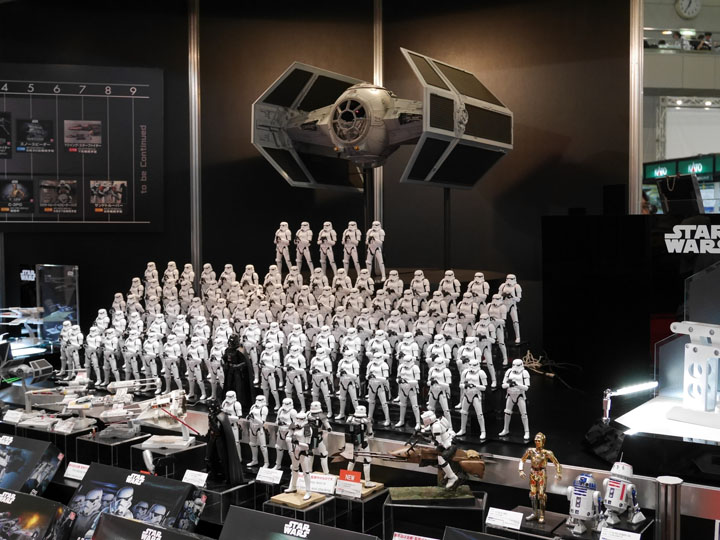 バンダイブースで来場者を迎えるのは、ダース・ベイダー率いるサンドトルーパーの軍団。もちろんガンプラも外せません。