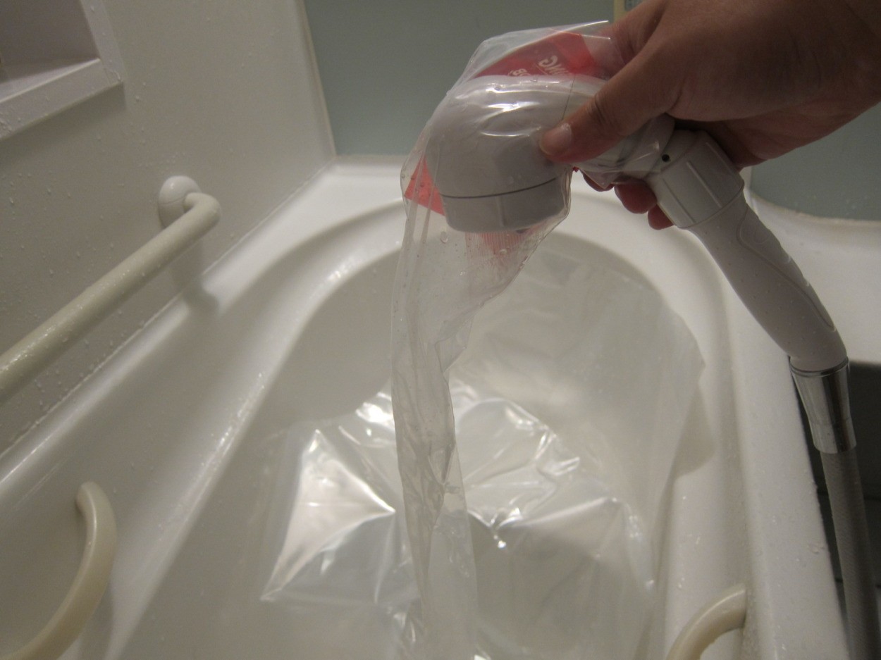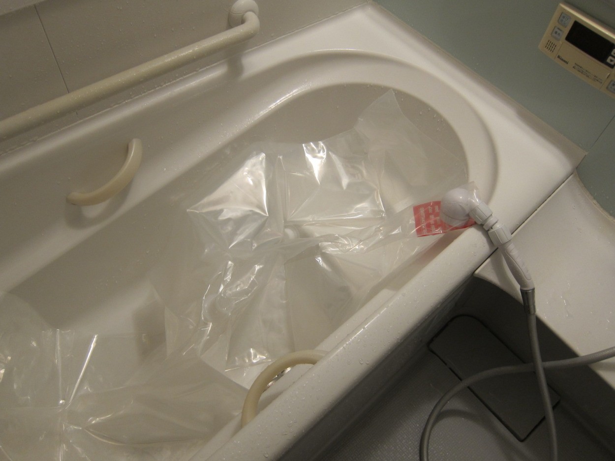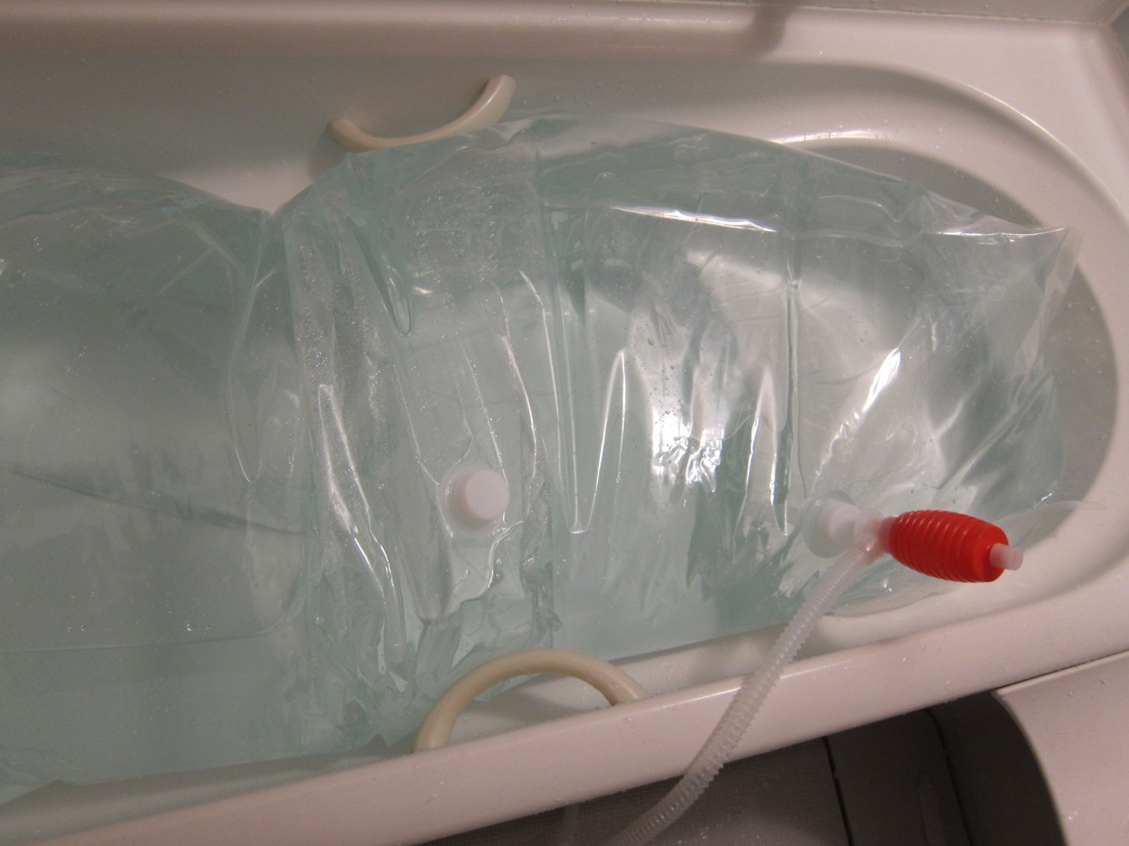 使い方は非常に簡単。フィルム容器をバスタブに寝かせ、給水口を蛇口にセット。