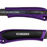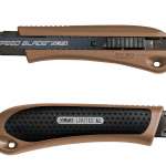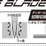 そして搭載している刃には、驚くほど軽い切れ味を実現した「スピードブレード」を搭載。スピードブレードとはオルファが開発した大型カッターナイフ用の替刃。もともと通常のカッターの刃よりも鋭角で切れ味が鋭い「特専黒刃」の研磨面にフッ素加工を施すことで切断時の抵抗を軽減しています。
