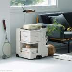 定番カラーの“ホワイト”の、やや青みを帯びた硬質な白さに対して、この“ストーンホワイト”は影の部分に灰褐色がかった色味を感じさせるやわらかなトーン。清潔感のある明るいカラーはキッチンやダイニングにおいても美しく映えるし、ウッディ素材や布の質感、自然光を活かしたインテリアにも好相性。もちろんワーキングスペースでデスクワゴンとして使ってもいいし、ベッドサイドでナイトテーブル代わりに、あるいはワードローブの近くにおいてドレッサー代わりに使っても。
