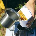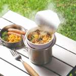 お湯を注いだ後はクッカーにカップ麺を入れれば、クッカーの熱によってカップ麺は暖かい状態をキープ。取っ手も付いているので、片手でしっかり掴みながら食べられます。