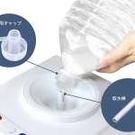 市販のペットボトルにジャストフィットする専用キャップは、25mmと28mmの2サイズが付属。取水棒を本体に取り付け、そこにペットボトルにつけた専用キャップ部分をセットすれば、水の流れがスムーズになります。専用キャップや取水棒、水受けトレーは取り外して洗えるので、いつでも清潔に使用可能です。