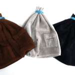 サイズは約W700×H340mm。少々厚め&ちょっと短めのフェイスタオルといったサイズですが、端についたスナップボタンを閉じて輪にして、中央に縫いとめられたゴムで束ねれば、ハットとして頭部をすっぽり覆えるようになっています。