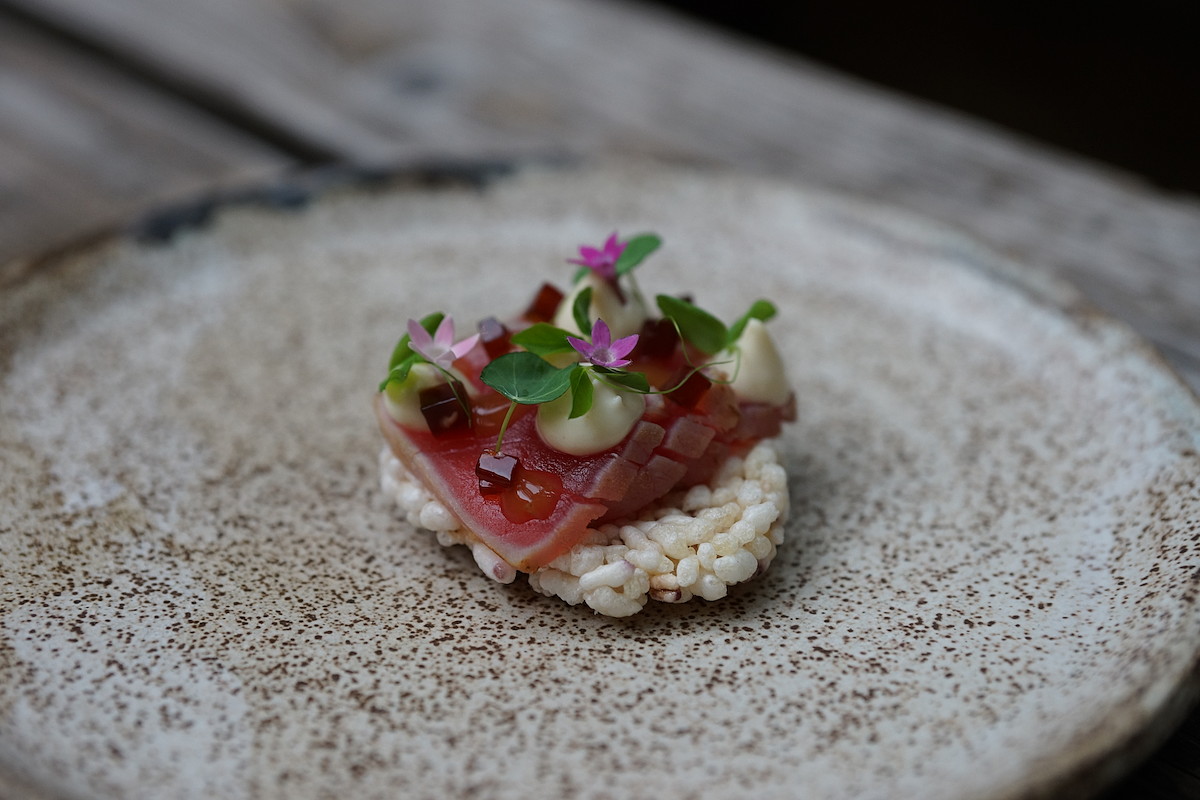 「寿司をモチーフとしたカナッペに、ライスクッカーとして使われた山むすびは、口に含んだ時の五穀それぞれの噛み心地が際立ってとてもいい」
