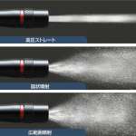 水流の調整はノズル先端部分で調整でき、高圧ストレート、扇状噴射、広範囲噴射を用途に合わせて使い分け可能。洗浄ボトルが付属されているので、洗剤を入れて本体に装着すれば洗車にもバッチリ。泡の量も切り替えが可能です。