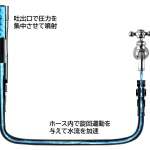 スタイリッシュな見た目のノズルは、消防隊が業務に使うストレートの筒先からヒントを得ており、水道に繋いだホース内に流れる水道水に旋回運動を与え、ノズル内部の螺旋状の溝でさらに水流を加速。吐出口から集中した圧力を与えた水を噴射することで、銃型のトリガー式タイプより角度による水圧の消耗が少なく高水圧を実現しています。