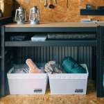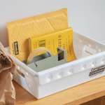 浅型の「ストレージトート S」(1430円)はW300×H95×D220mmで、デスク・キッチンアイテムの収納に便利なサイズ。玄関のシューズボックス周辺に置いて、シューケア用品を入れてもよさそうです。耐荷重は約5kg。