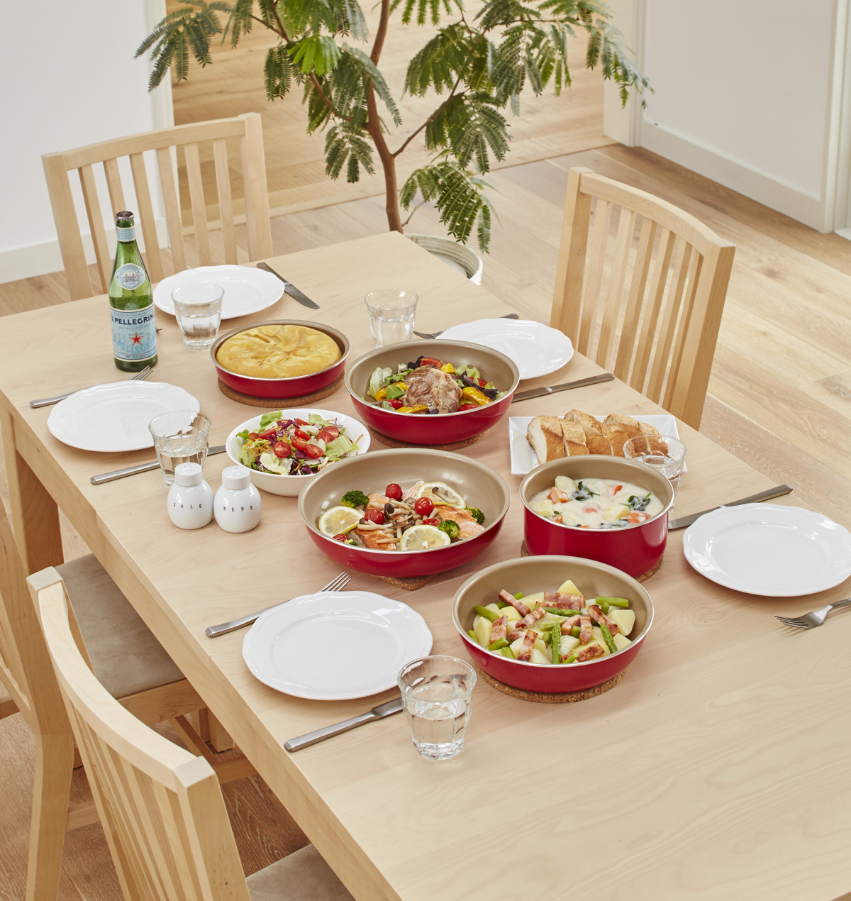 「evercook」とは、“ever(ずっと)cook(料理)をしたくなる”フライパンをコンセプトとしたキッチンブランドです。本体のアルミニウムに独自のアンカー構造を施すことで、熱に弱い接着剤を使わずにフッ素コーティングしたフライパンになります。フッ素コーティングがはがれにくいので、こびりつきにくさが長持ちするのが特徴で、強さは耐摩耗性試験を50万回もクリアしているというから驚きです。