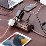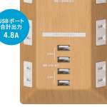 差し込み口は未使用時にホコリが入るのを防ぐシャッター付きで、火災予防にも効果的。上面には、タブレットやスマホの充電に最適なUSB充電ポートを4ポート搭載。合計出力4.8Aで、ACアダプタを別途用意しなくても4台のデバイスを同時に充電できます。